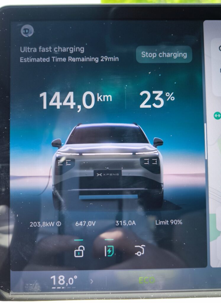 Laddningen är blixtsnabb – G9 är byggd på en 800-volts teknik, vilket möjliggör ultrasnabb laddning upp till 300 kW. Detta betyder att bilen gick från 18 % till 82 % laddning på under 20 minuter när jag laddade den på en snabbladdningsstolpe – imponerande och praktiskt i verkligheten. Men detta kräver att bilen är förinställd inför laddningen.